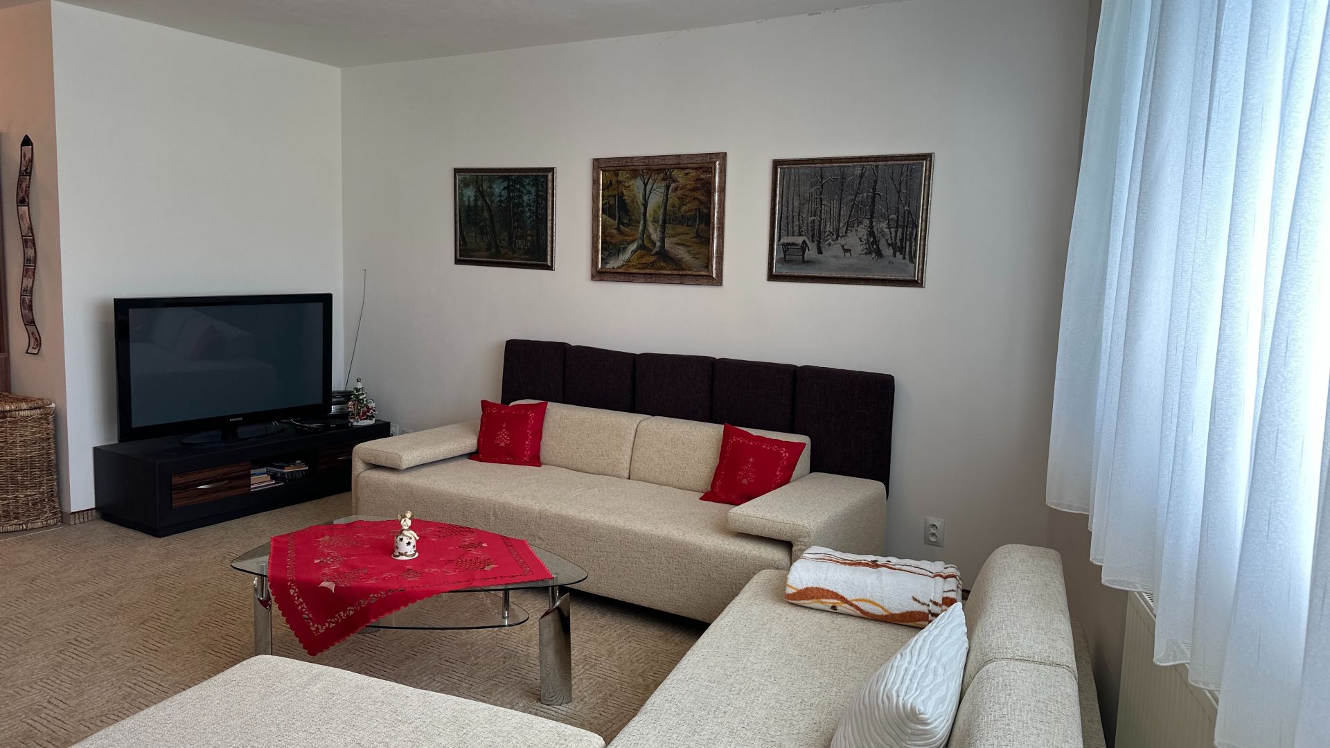 Spálňa zariadená manželskou posteľou, ponúka dostatok priestoru na odpočinok a relaxáciu. Moderné vybavenie, ako je plochá TV a praktické úložné priestory, zabezpečuje komfort a pohodlie. Obývacia izba je zariadená modernými prvkami, vrátane pohodlnej pohovky a jedinečných možností sedenia, čím vytvára všestranný priestor, ktorý je ideálny na stretnutia s priateľmi alebo rodinou.